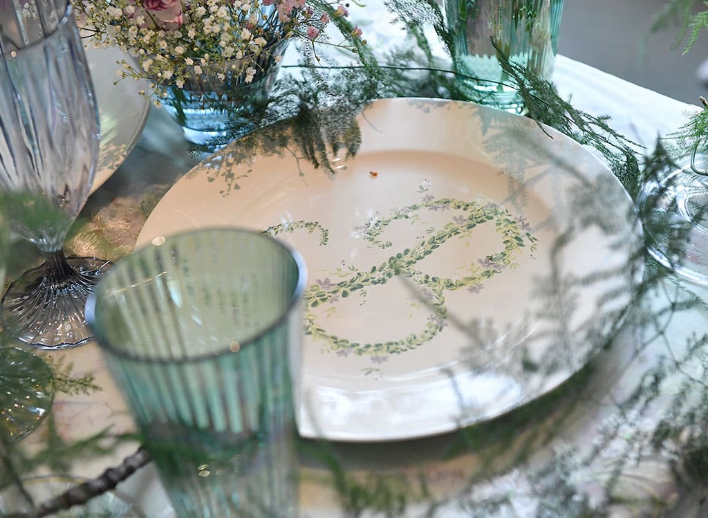 Sunlight streams through coloured glasses, whilst fields of spring flowers, rendered in porcelain, form the table centre piece, all presented on an elaborate tablecloth. Beauty is evoked through both small and larger details, which create a dialogue between nature and the home.