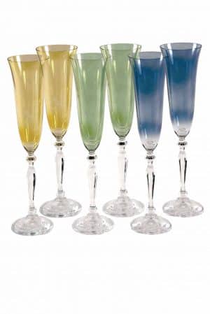 This set of six chalice flute glasses is crafted in vibrant colors: red, purple, pink. The glass features a smooth finish on the exterior.
