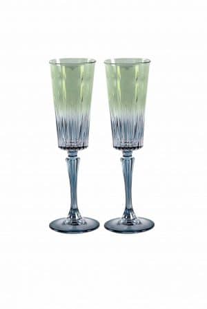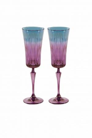 This set of two chalice flute glasses are crafted in vibrant shades, with iridescent gleam.