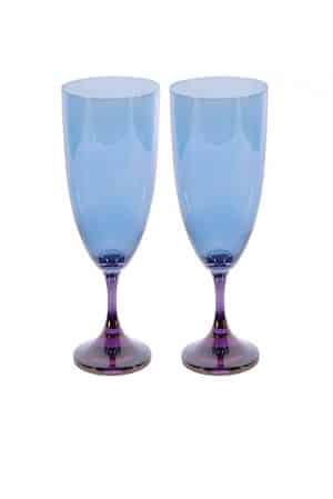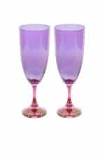 This set of two chalice flute glasses is crafted in a vibrant shade from pink to purple. The glass features a smooth finish on the exterior.