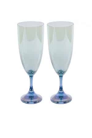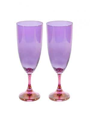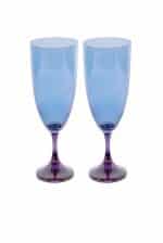 This set of two chalice flute glasses is crafted in a vibrant shade from purple to blue. The glass features a smooth finish on the exterior.