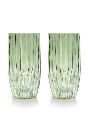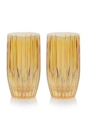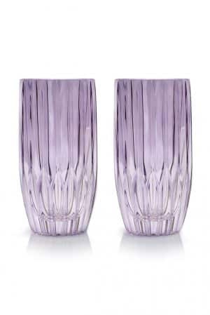 This set of two tumbler water glasses is crafted in a vibrant shade of blue. This glass is vertically grooved with a finish of iridescent.