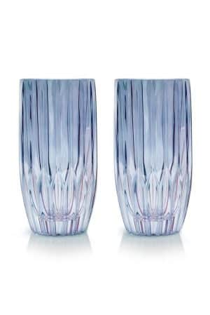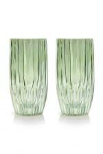 This set of two large tumbler glasses is crafted in a vibrant shade of green. This glass is vertically grooved with a finish of iridescent.
