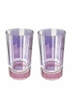 These faceted glass tumblers are crafted with vibrant stripes in purple and transparent, complemented by a pink base.