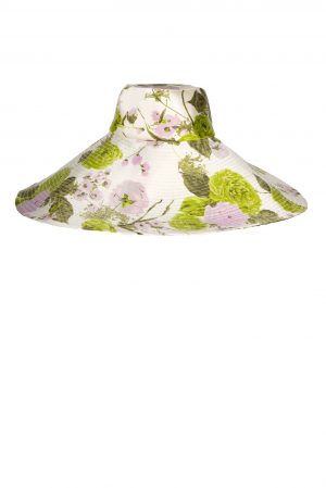 This wide-brimmed hat is made from floral printed taffeta. Soft and romantic, it adds poetry to any outfit. You can wear it with a dress for a summer look or match it with jeans for a day in the city.