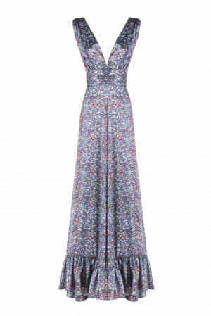This greek style gown is made from silk printed with roses. With a high waist, A silhouette and a ruffle on the bottom, the dress is very fluid and refined. Season-less. You can wear it with our matching shoes in the same print.