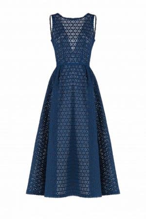 This eyelet dress has a boat neckline and a relaxed fit.