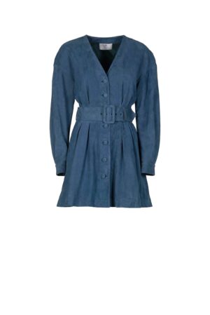 This mini dress is made in precious deep red corduroy fabric. Featuring a belt and v-neck, it could be worn with printed tights becoming a statement piece or with a pair of wide pants and a turtleneck for a vintage vibe.