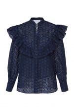 This cotton blouse is designed with a mock neckline ruffled bib and a straight silhouette.