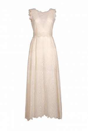 This midi dress is crafted in embroidered cotton eyelet; it is cut for an A-line silhouette and has a boat neckline in the front and open rounded back.