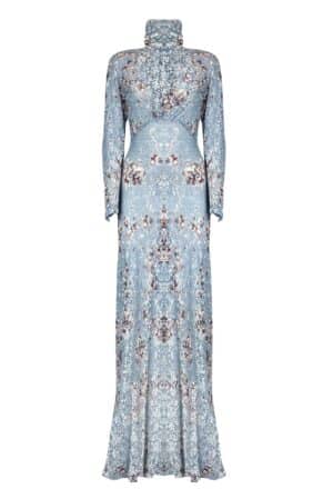 Floral devoré velvet dress, cut on bias for a confortable fit, tight long sleeves and high neck.