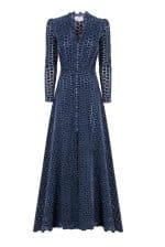 This floral embroidered midi dress features a scalloped v-neckline with an A-line silhouette and long sleeves.