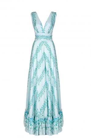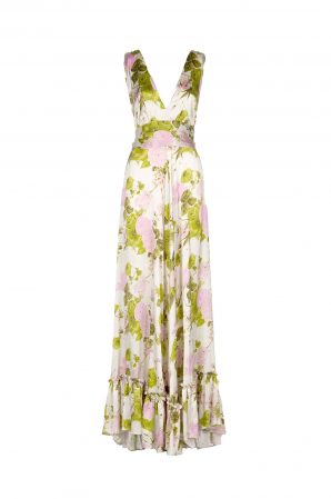 This gown is made from floral printed satin silk; it is loose in the bodice with a deep V neckline and a flounce at the bottom.