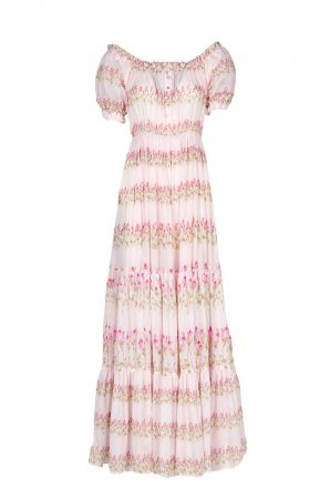 The maxi dress is crafted in a floral cotton organdy. It has a carmen neckline, short puffy sleeves and gatherings in the skirt.