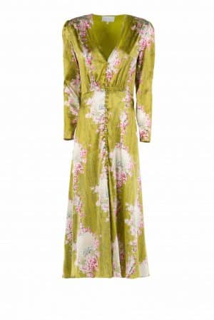This Bottoncino dress is made in Flower garland print. Our signature model is designed in light turquoise silk, with V-neckline and silk covered buttons front fastening. Combine it with high heels for a cocktail look.