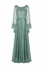Maxi teal green dress in chiffon with peplum sleeves and bias cut gathered skirt.