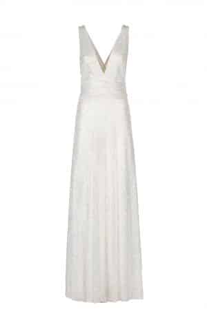 • A-line silhouette, sleeveless, V-neck, bow back, sequined, lined