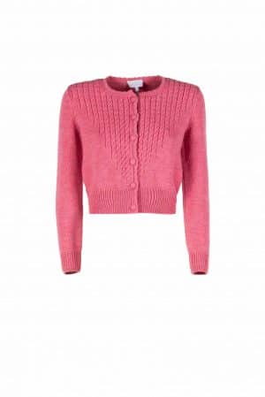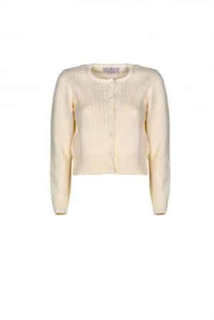 This cable knit cardigan has a round neck with little buttons closure in the front.