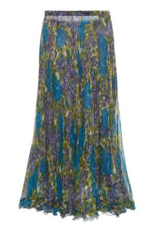 This chiffon silk plissé skirt feautures a double ruffle at the hem.