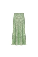 This skirt is made of sequin-covered tulle. It is cut on the bias to allow the fabric to create a soft ruffle at the bottom. Wear it with its matching top (sold separately) for a dazzling look.