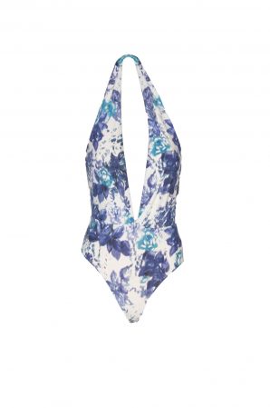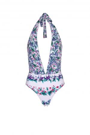 This gorgeous one-piece swimsuit is designed in red, yellow and green lycra in print in Abstract Flowers. It has a V neckline with wide panels that tie up on the neck and create a dramatic open back. Wear it with our matching hat and shorts in the same print to be the star of your pool party.