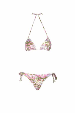 This two-piece swimsuit is designed in blue Monet printed lycra. It has an adjustable triangle bikini top and low waist slip with ties. You can wear it matching with shorts and pareo in the same print.
