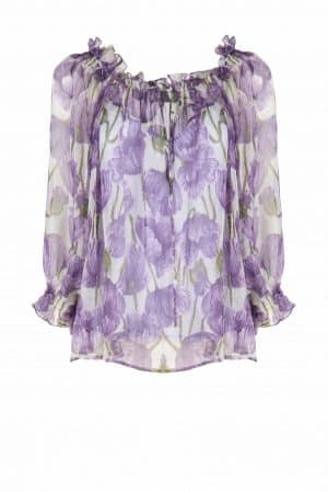 Cut from silk chiffon crepon, this sheer and airy Capri blouse is a perfect choice for a vacation. With a drawstring on the neckline you can wear it off the shoulder matching with stacked necklaces or tie it on the neck for a more casual look.