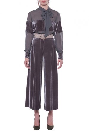 This shirt is realised with printed chiffon crepon. It has round collar neck and covered buttons in the front with rouches. It comes with a camisole in solid color.