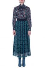 The georgette blouse is embroidered with silk stitched details and velvet applique butterflies. It features a bow or a scarf at the neckline with a sheer silhouette and long cuffed sleeves.