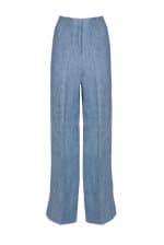This pants have a high-rise waist falling into a pooling wide-leg hem.